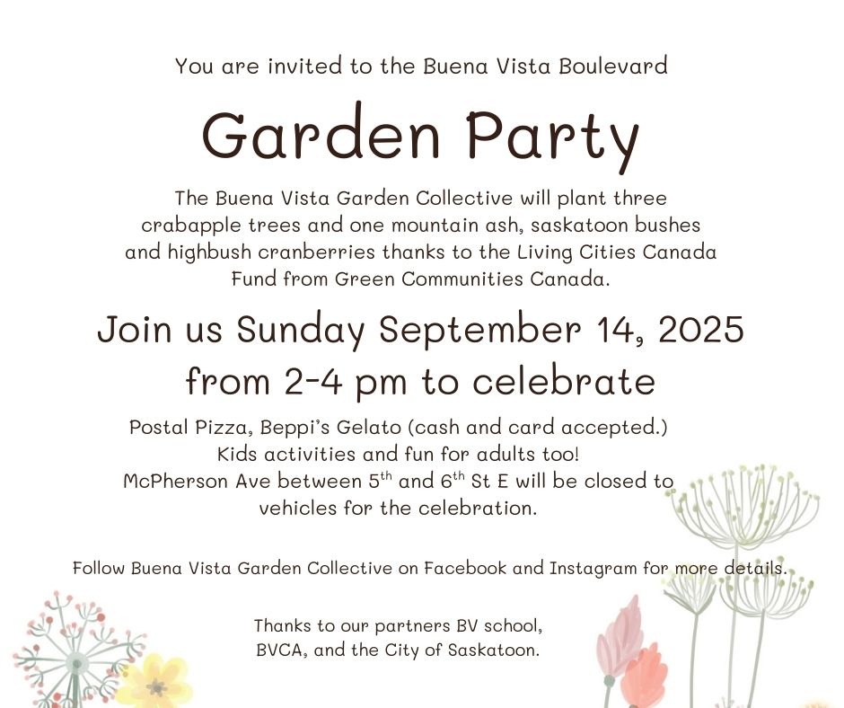 Join us September 14 from 2-4 pm for our garden party to celebrate the planting of four trees and the addition of some bushes thanks to money from Living Cities Canada Fund and Green Communities Canada. We are excited to have a great lineup of guests and activities: